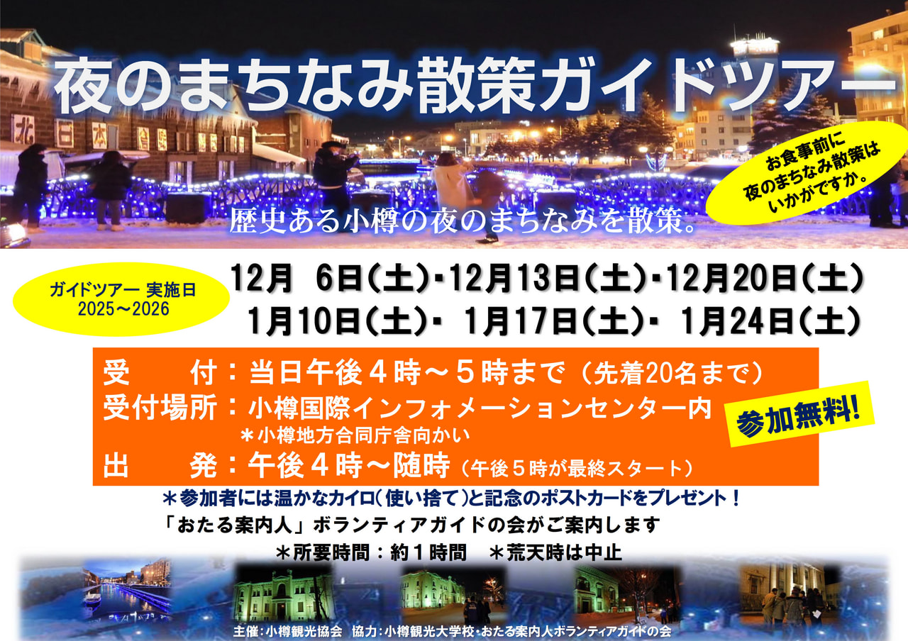 携帯用カイロとポストカードももらえて、歴史ある小樽の夜をガイド付きで散策する、贅沢なツアーです!