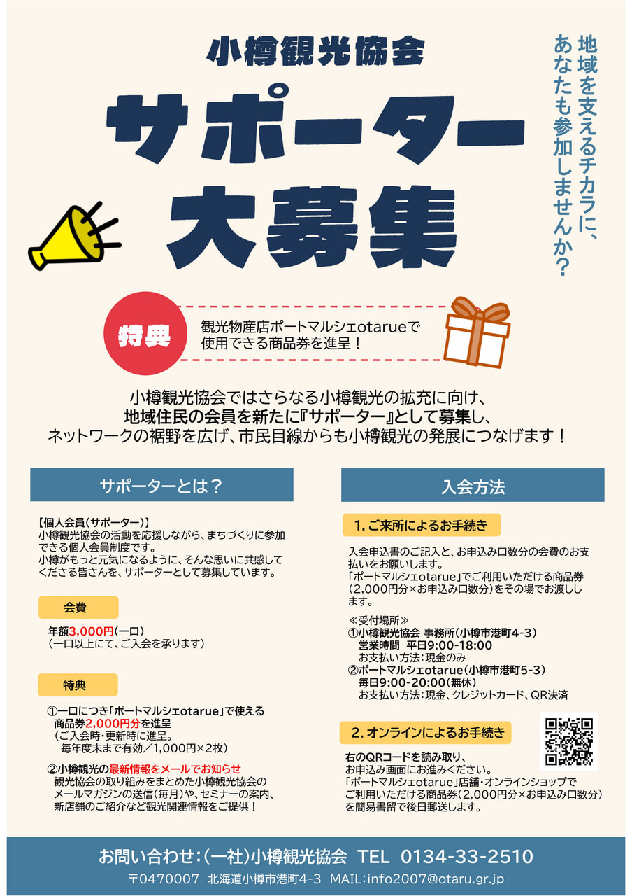 当日ご参加の皆様にはご案内させていただきましたが、観光大学校の事務局を担っている小樽観光協会では、小樽観光拡充を目指し、「サポーター」を大募集しております。